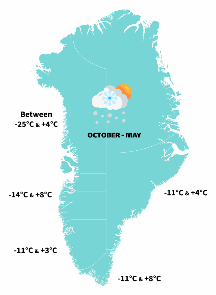 Because Greenland is so vast, it is hard to generalise about its weather and temperatures. They vary greatly between – and even within – regions. These temperatures represent the range of average temperatures throughout the winter season in the different regions of Greenland. These temperatures are only advisory and are averages over a period of years. You may encounter considerably colder or warmer temperatures on site. One of the best sources to check the weather day by day once you’re in Greenland is the DMI website.